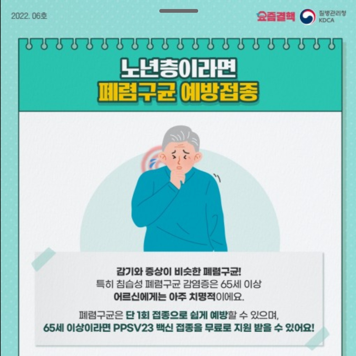폐렴구균 백신은 50세 이상 또는 기저질환자는 PCV13 (프리베나 13) , 65세 이상 중장년층 또는 고위험군 PPSV23 (프로디악스 23) 두 가지 종류가 있으며, 개인의 건강 상태에 따라 접종 스케줄이 다릅니다.