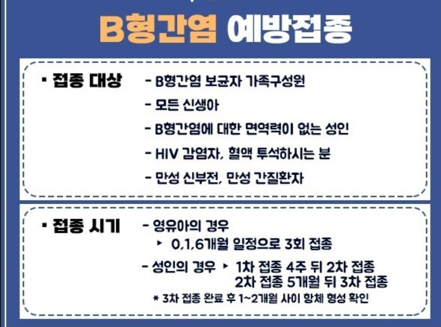 B형 간염은 간암의 주요 원인 중 하나로 항체가 없는 경우, 예방접종이 필요합니다. 총 3회 접종(0, 1, 6개월 간격)으로 이루어지며, 항체 검사를 통해 접종 여부를 결정하시면 됩니다.