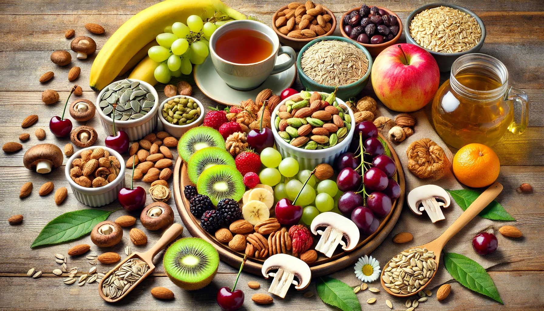 타트체리(몽모랑시 체리) , 키위 ,바나나, 포도(특히 적포도) ,피스타치오 ,아몬드 ,호두, 호박씨, 귀리(오트밀), 현미, 카모마일차, 버섯류 (표고버섯, 느타리버섯 등)
