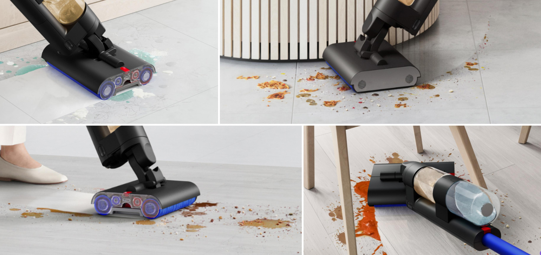 기존 물청소기는 롤러 하나로 닦아내는 방식이라, 얼룩이 완벽히 제거되지 않는 경우가 많았는데요. 다이슨 WashG1™은 두 개의 고밀도 마이크로파이버 롤러 브러시가 반대 방향으로 회전하면서 더욱 강력한 청소력을 보여줍니다.
