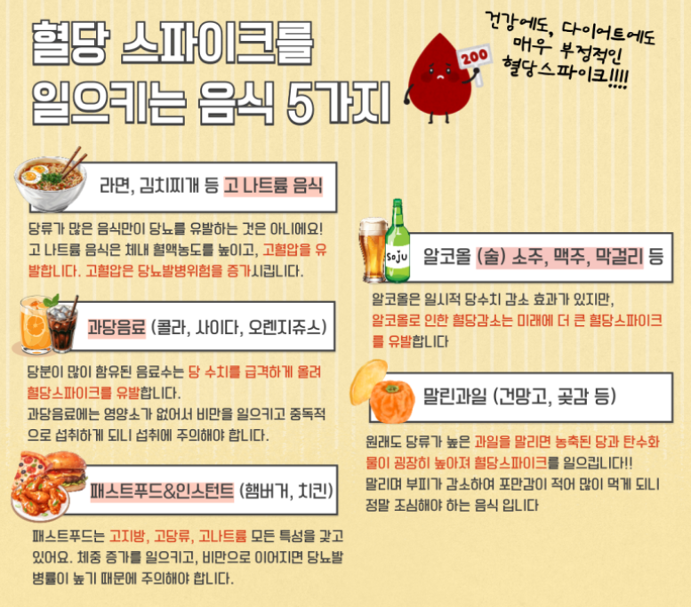 혈당 스파이크(Blood Sugar Spike)란 특정 음식을 섭취한 후 혈당이 급격히 상승했다가 빠르게 떨어지는 현상을 의미합니다. 이러한 혈당 변화가 자주 발생하면 당뇨병, 혈관 질환(심장병, 뇌졸중) 등의 위험이 높아질 수 있습니다. 맥주는 보리 맥아의 전분에서 유래한 탄수화물이 포함되어 있어, 혈당을 빠르게 올릴 가능성이 있습니다.