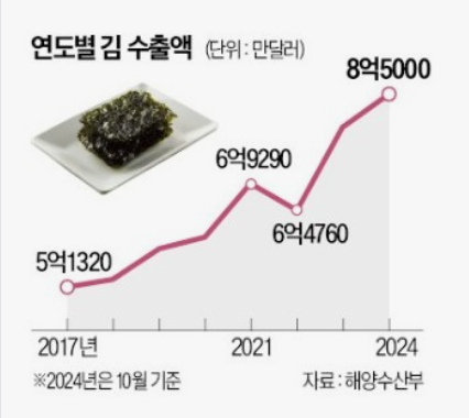 “수출 물량이 늘면서 국내 김 가격도 덩달아 올랐다. 원초 생산량은 줄고, 냉동 김밥 수요까지 더해져 수급이 타이트해졌다.” – [연합뉴스, 2024.03]