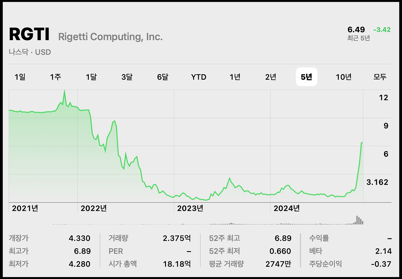 라몬트 부사장은 양자 컴퓨팅 관련 주식인 ‘리게티 컴퓨팅(Rigetti Computing)’의 주가 변동 사례를 대표적인 예로 들었습니다. 지난해 말, 한국 투자자들이 약 1억 달러를 집중 매수하면서 리게티 컴퓨팅의 주가는 한 달 만에 무려 1,400% 급등했습니다. 그러나 이후 주가는 급락하여 현재 고점 대비 55% 하락한 상태입니다.
