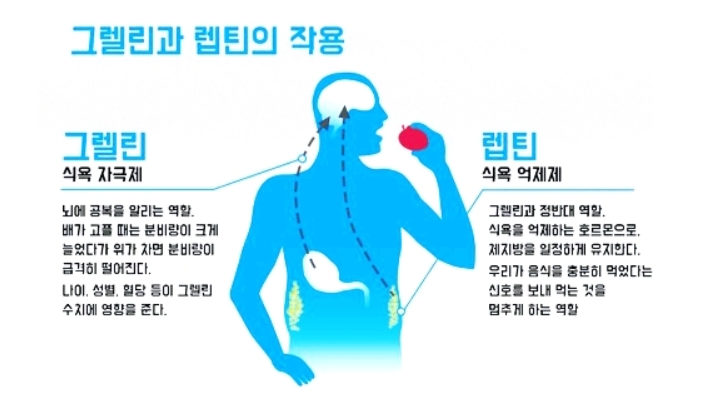 • 스트레스나 피로가 쌓이면 그렐린이 증가하여 폭식을 유도하고,