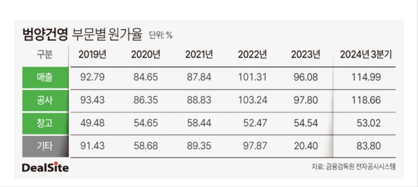범양건영은 최근 3년간 지속적으로 적자를 기록하며 재무 건전성이 악화되었습니다. 특히 2024년 영업손실은 297억 원, 순손실은 323억 원에 이르며 기업의 지속 가능성에 대한 우려가 높아졌습니다. 건설 원가가 크게 상승하며 공사원가율이 100%를 초과했고, 이로 인해 적자 폭이 점점 확대된 상황입니다.