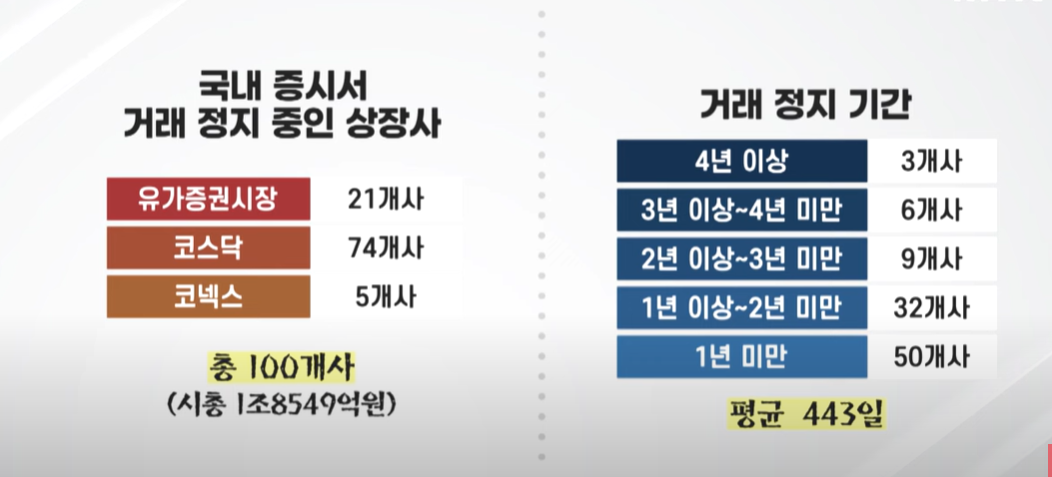 이들 기업의 평균 약 438일로, 1년 이상 거래가 중단된 기업이 절반에 이릅니다. 특히 일부 기업은 4년 이상 거래정지 상태를 유지하며, 투자자들의 자금이 장기간 묶이는 문제가 발생하고 있습니다.