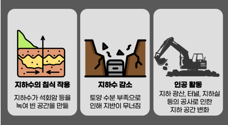 • 과도한 지하수 취수 또는 굴착 시 지하수가 빠져나가면 지하에 공동이 형성됩니다.