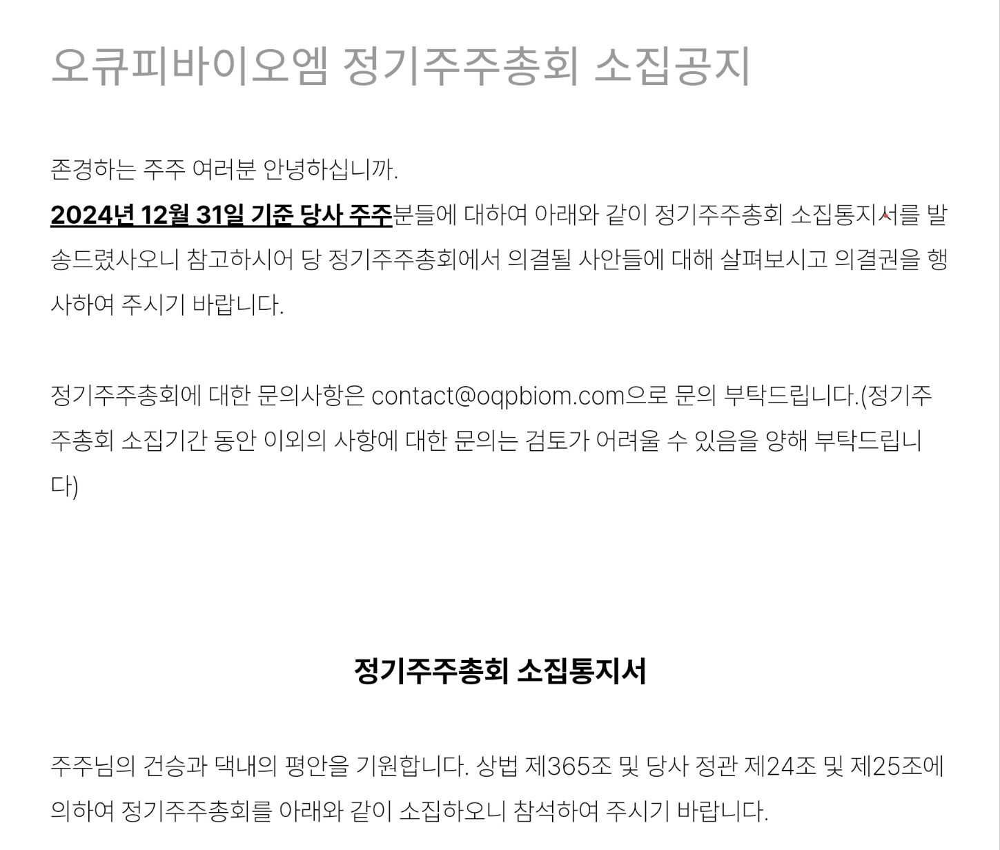 오큐피바이오엠은 2025년 3월 21일에 정기주주총회를 개최할 예정이라고 메일을 받았습니다. 이번 주주총회에서는 영업보고, 재무제표 승인, 이사 선임, 배당 관련 논의 등이 이루어질 것으로 예상됩니다. 특히, 개인 투자자들도 이번 총회에서 의결권을 행사할 수 있으며, 주주로서 중요한 경영 사안에 직접 참여할 기회를 가질 수 있습니다.