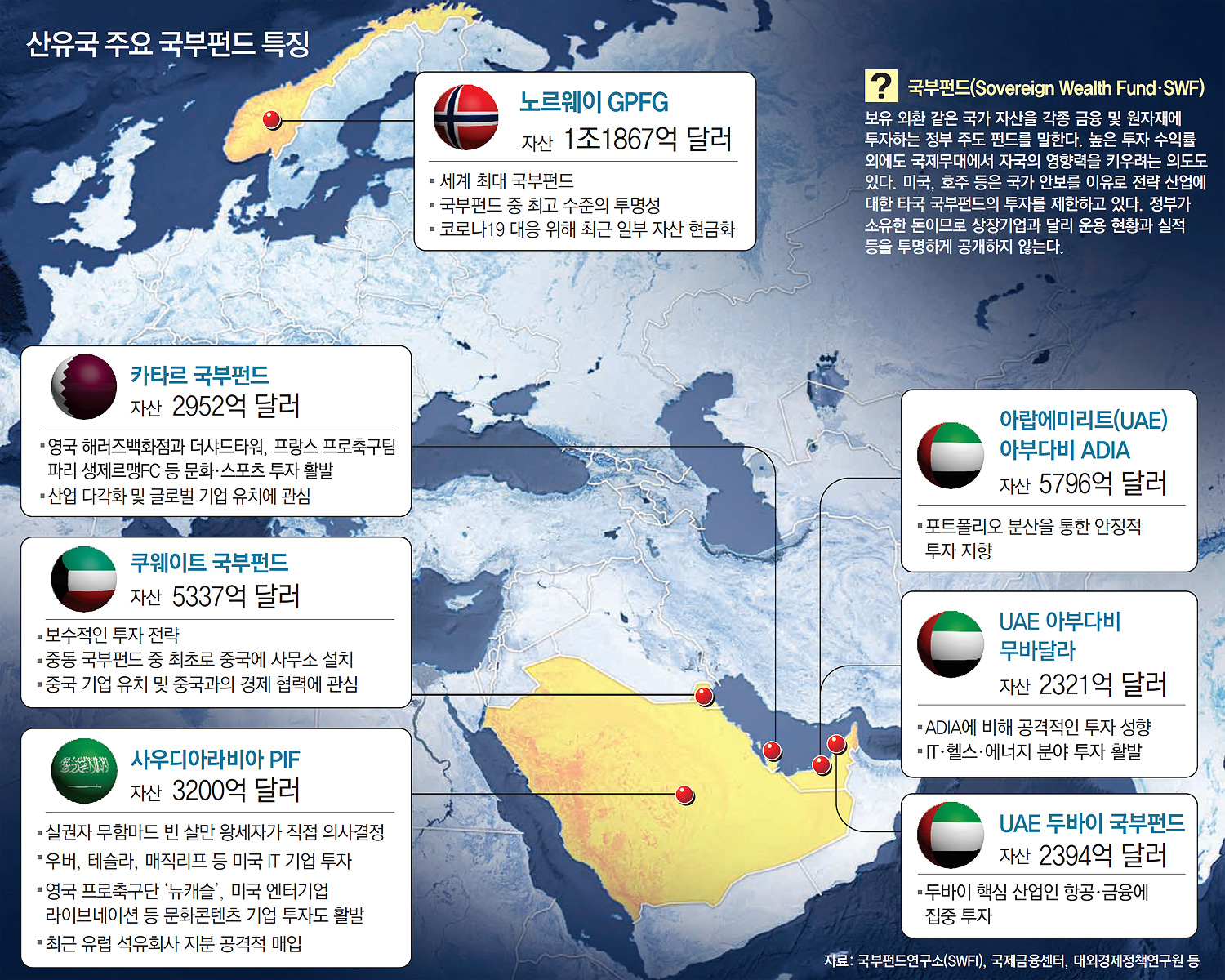 국부펀드(Sovereign Wealth Fund, SWF)는 국가가 직접 운영하는 대규모 투자 펀드를 의미합니다. 원래는 석유나 가스 같은 천연자원이 풍부한 국가들이 남는 수익을 효율적으로 운영하기 위해 만든 것이 시초인데요.