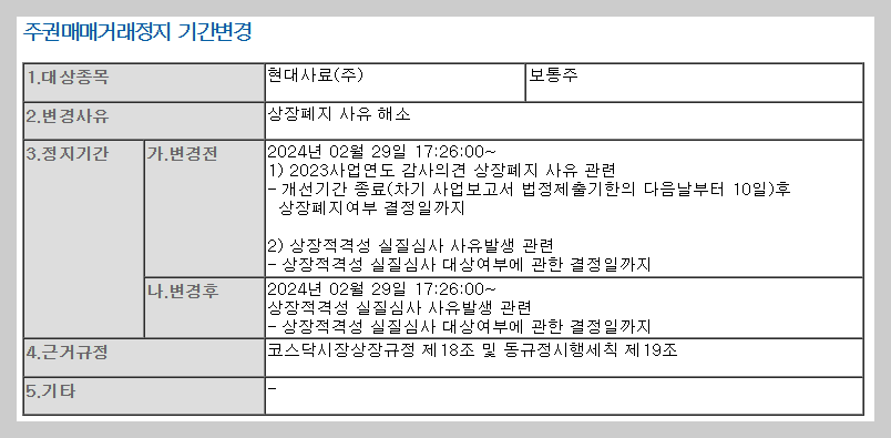 하지만 2025년 3월 31일 자로 정정된 감사보고서를 재제출하면서, 감사의견이 ‘적정’으로 변경되었고, 이에 따라 형식적 상장폐지 사유는 해소되었습니다.