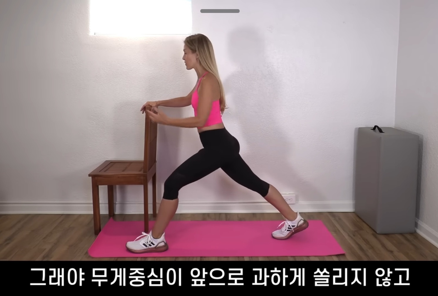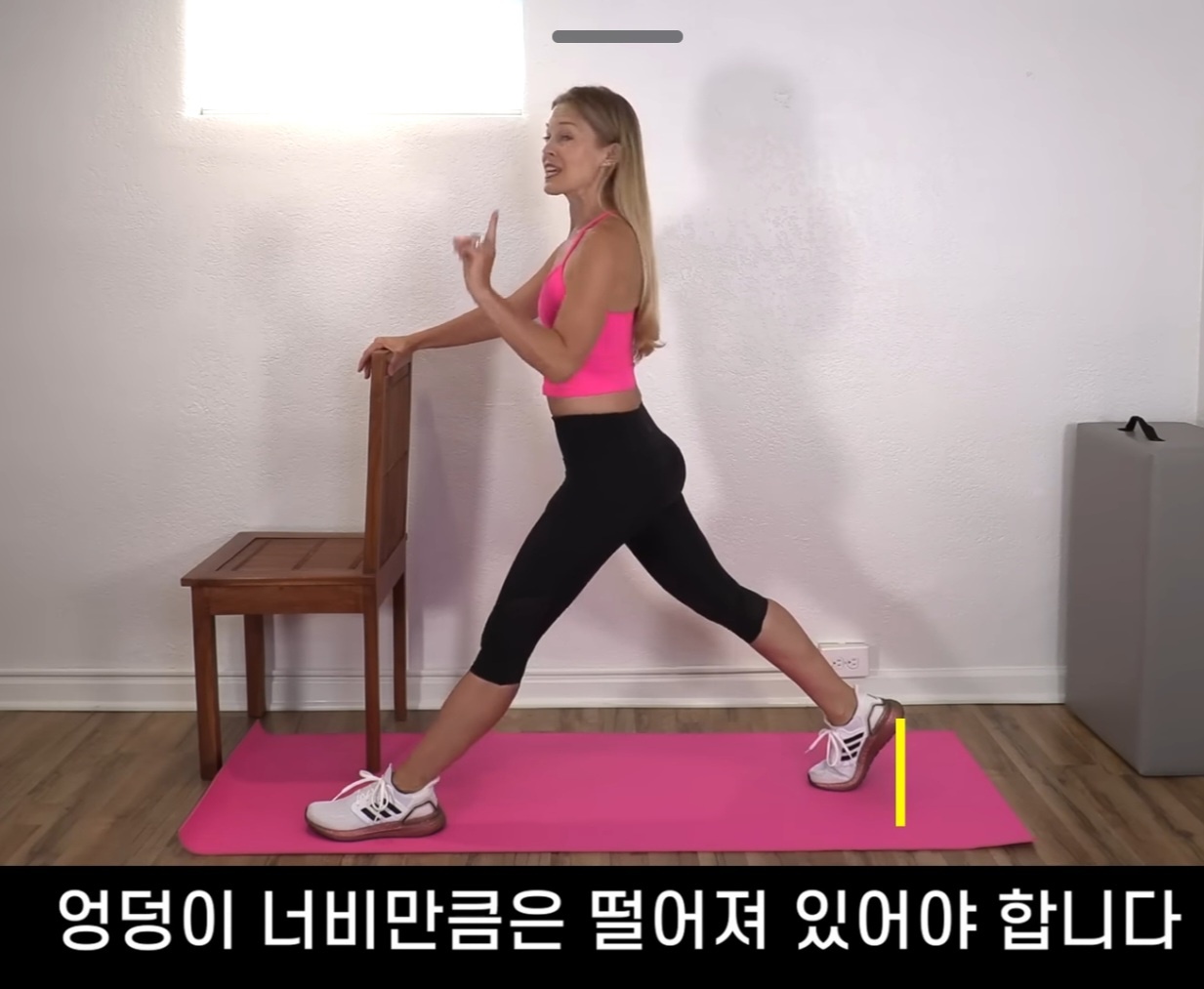 - 왼발을 앞에 두고, 오른발을 최대한 뒤로 뻗습니다.