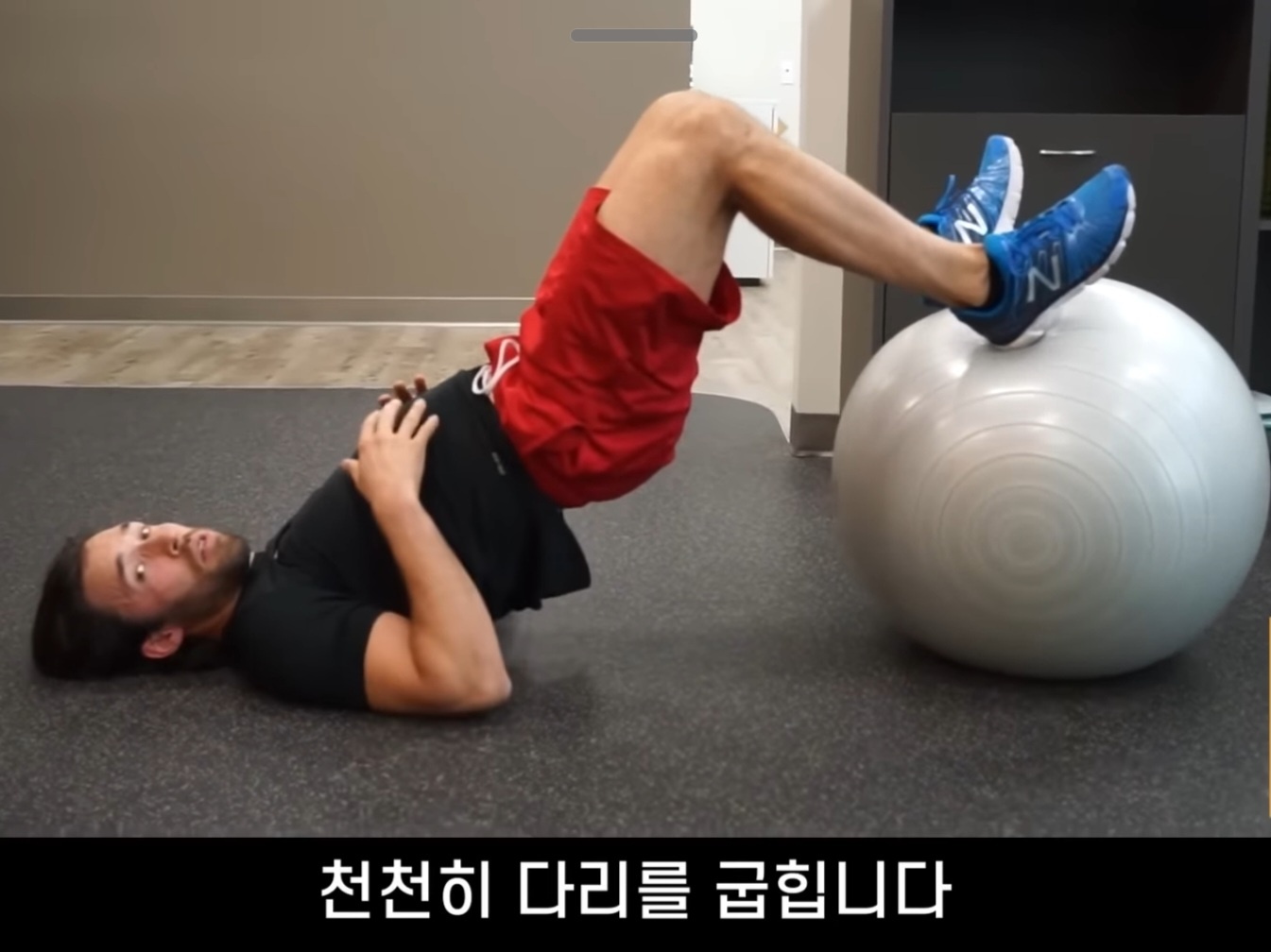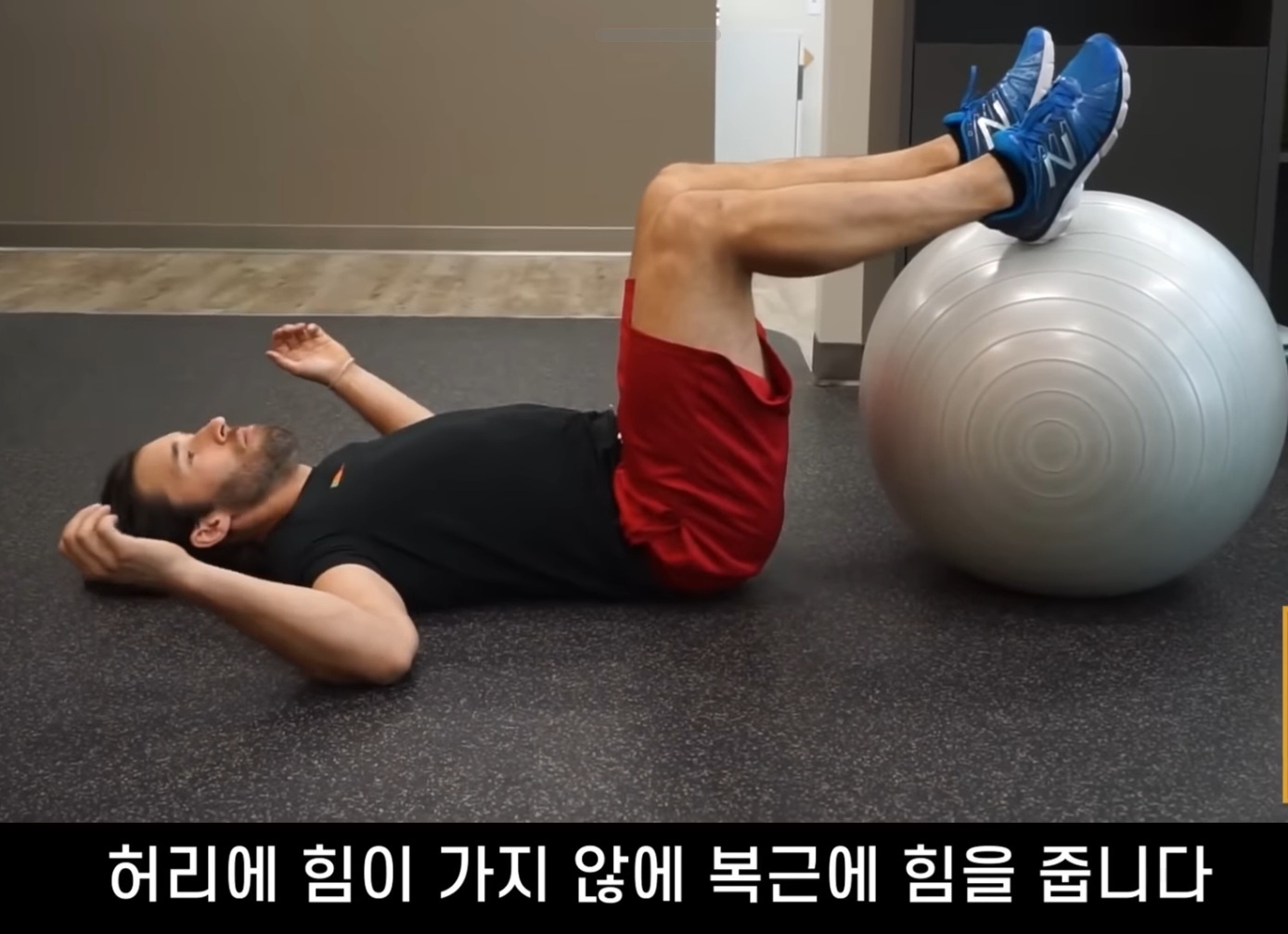 - 바닥에 누워서 발뒤꿈치를 짐볼 위에 올립니다.