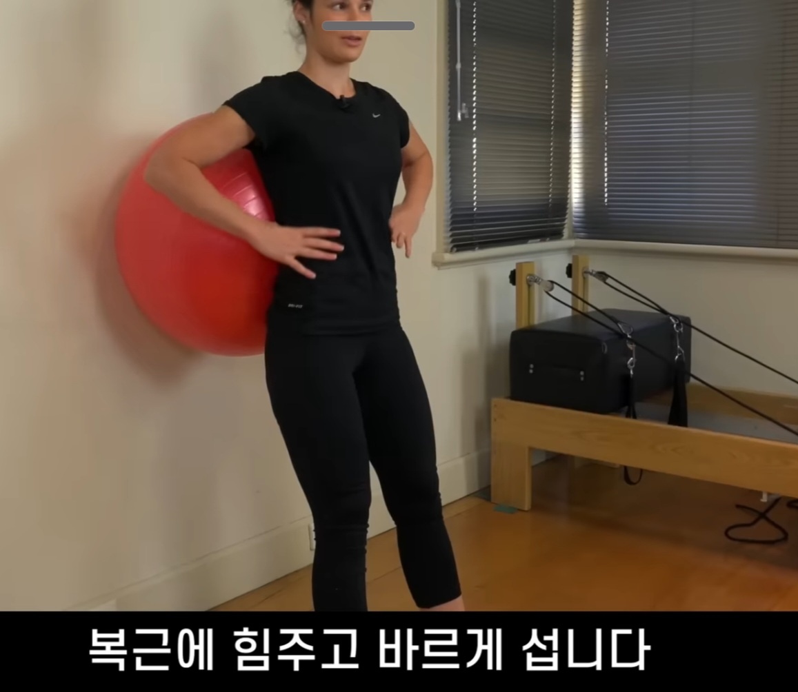 - 큰 운동용 볼을 벽과 허리 사이에 두고 섭니다.
