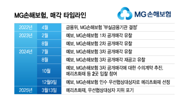 MG손해보험은 2022년 부실 금융기관으로 지정되었으며, 이후 매각을 추진해 왔습니다. 하지만 그동안 네 번의 매각 시도가 무산되었으며, 최근에는 메리츠화재가 인수를 검토했으나 결국 협상 끝에 포기했습니다.